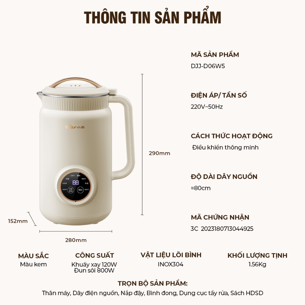 Máy làm sữa hạt Bear DJJ-D06W5 thực sự là một khoản đầu tư xứng đáng cho sức khỏe và sự tiện nghi của gia đình bạn. Với hiệu suất cao, đa dạng chức năng, thiết kế thông minh và đặc biệt là sự an toàn tuyệt đối, đây chắc chắn sẽ là “trợ thủ” đắc lực, giúp bạn dễ dàng tạo ra những món đồ uống và bữa ăn bổ dưỡng, góp phần xây dựng lối sống lành mạnh hơn mỗi ngày. Để đặt hàng, bạn có thể mua ngay trên web bearplus.vn hoặc gọi ngay đến số 18006018 để biết thêm thông tin chi tiết về sản phẩm nhé!