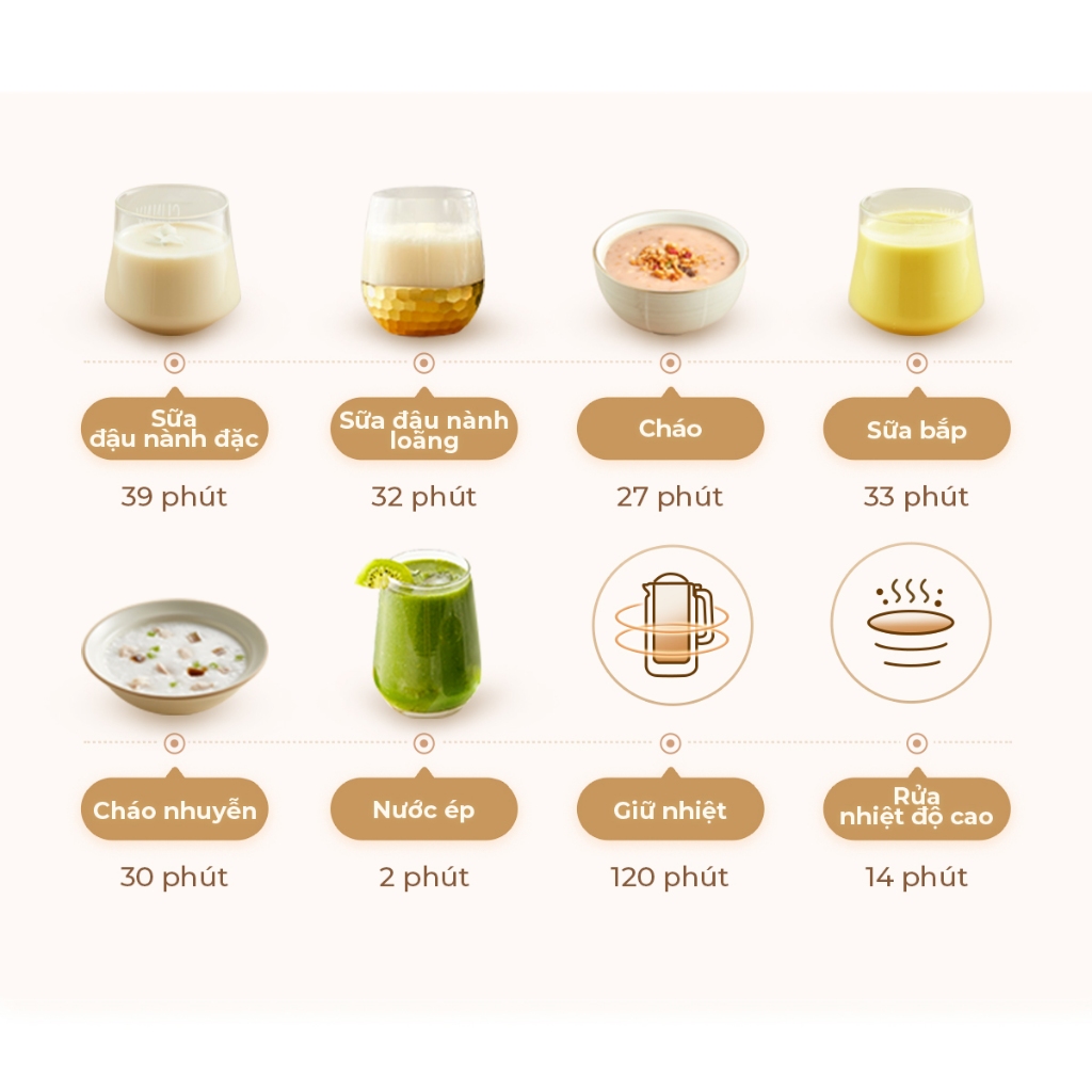 Menu 8 tuỳ chọn tiện lợi Hẹn giờ 12 giờ Giữ nhiệt 2 giờ Vệ sinh nhiệt độ cao với 1 nút bấm Gia nhiệt nhanh Hoạt động êm dịu |
