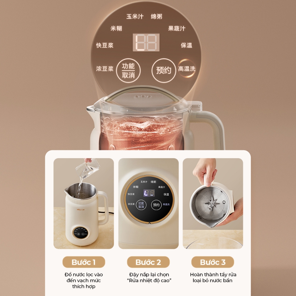 Sau khi tận hưởng ly sữa hạt thơm ngon, việc vệ sinh máy thường là điều khiến nhiều người quan tâm. Nhưng với Bear DJJ-D06W5, đó không còn là vấn đề. Chức năng tự động vệ sinh bằng nước nóng (High Temp Cleaning) giúp hòa tan và loại bỏ cặn bẩn cứng đầu chỉ với một nút chạm. Máy sẽ tự động làm sạch khoang cối, giúp bạn tiết kiệm thời gian và công sức, đồng thời đảm bảo máy luôn sạch sẽ, vệ sinh cho lần dùng kế tiếp.