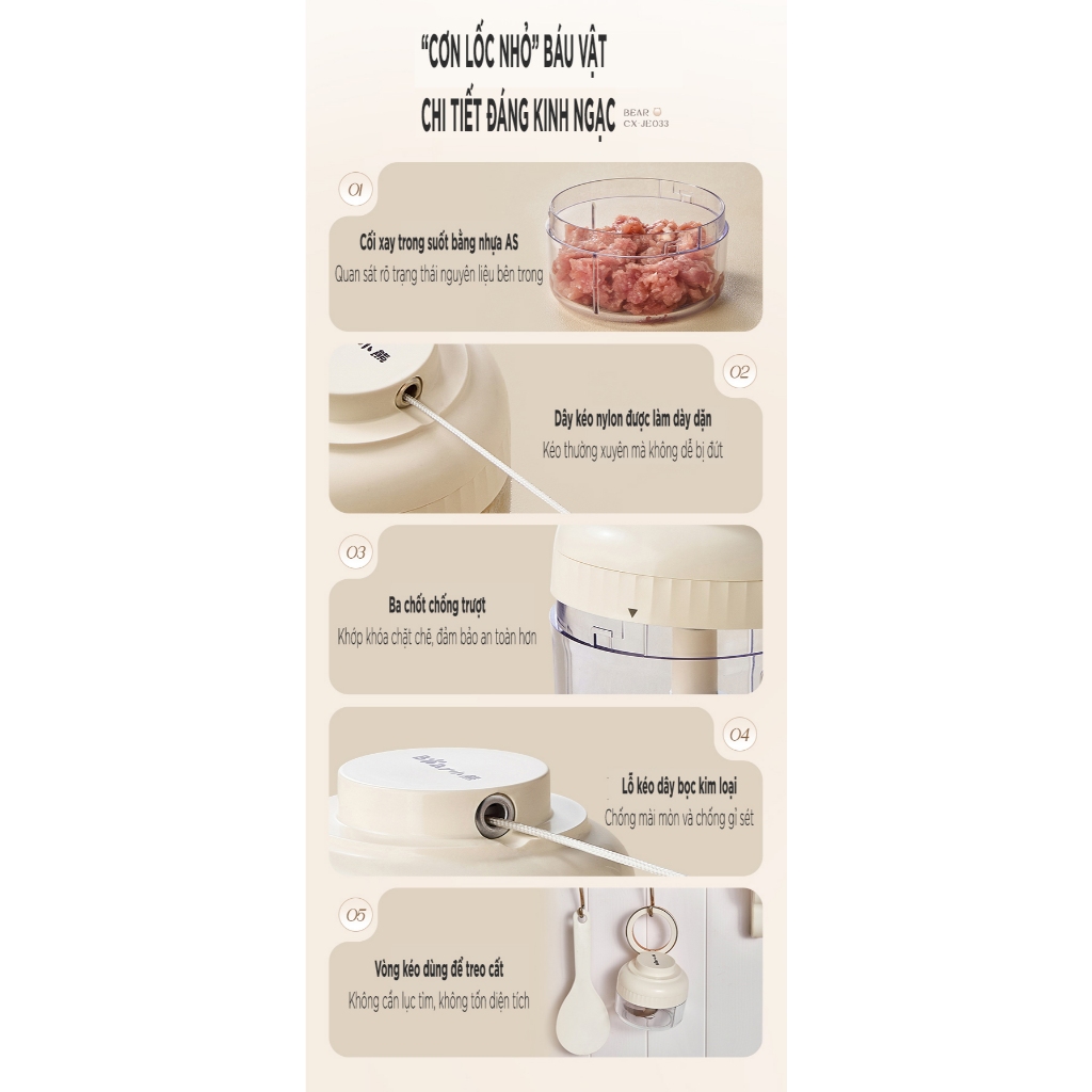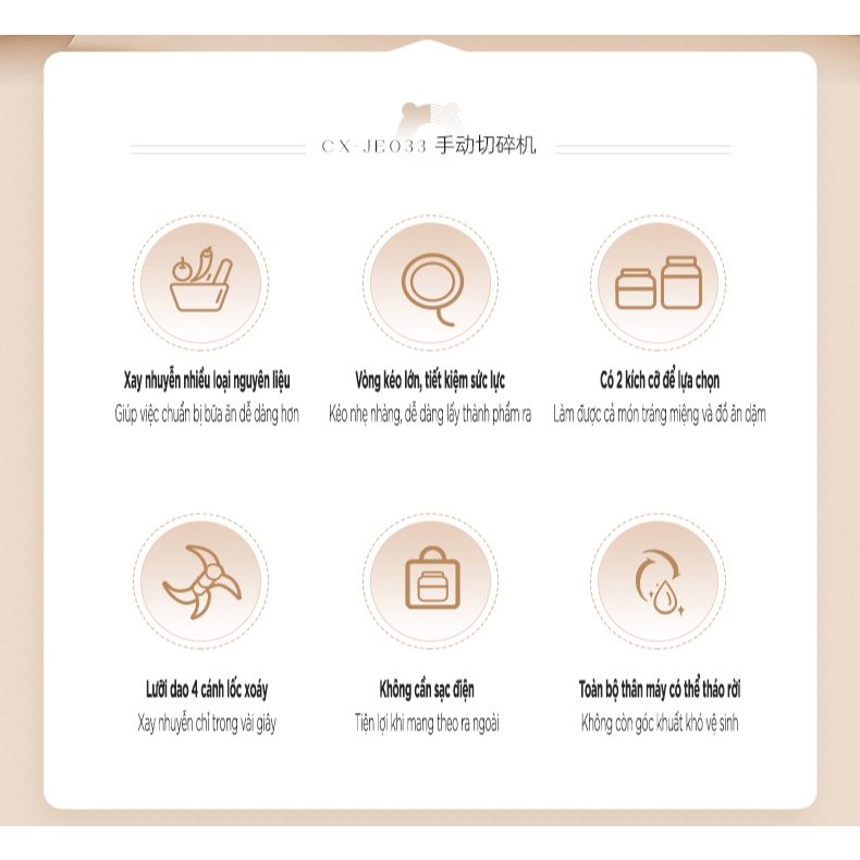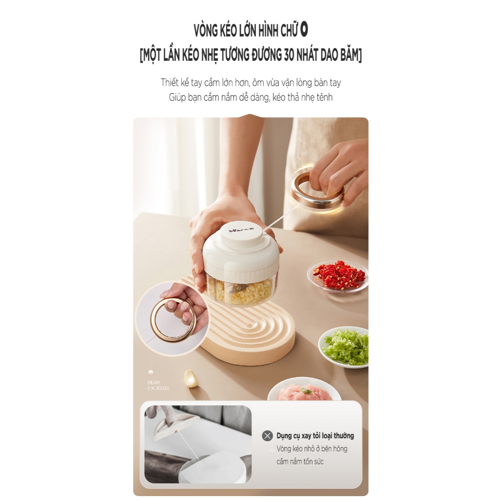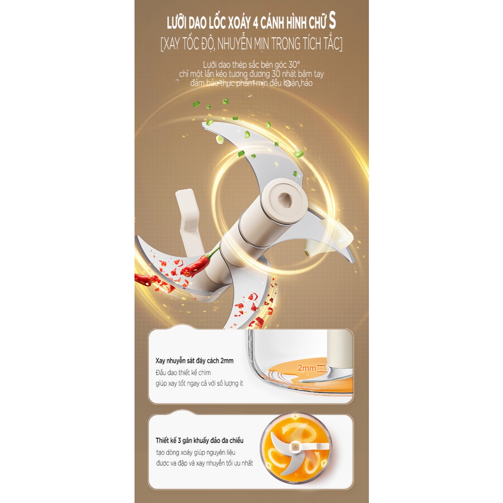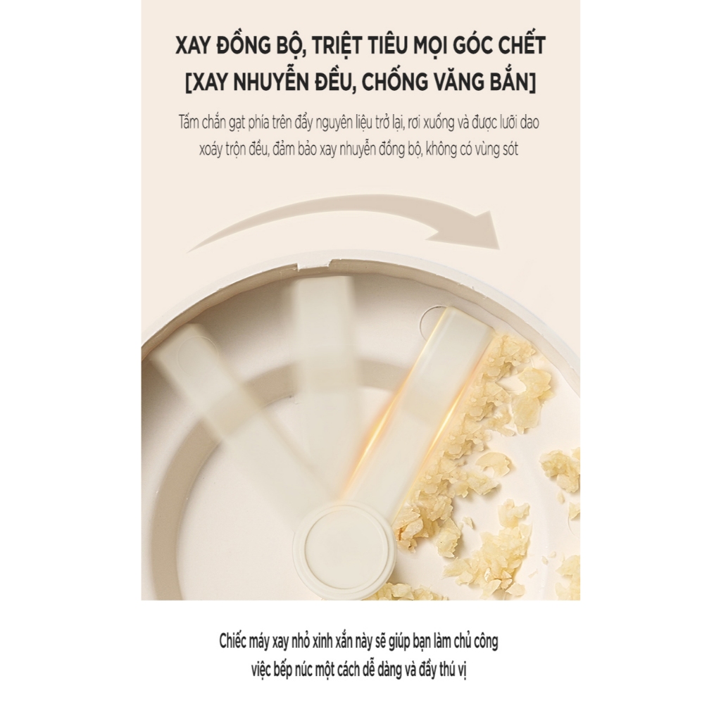 – Công dung: xay thịt, rau củ, tỏi. ớt, …